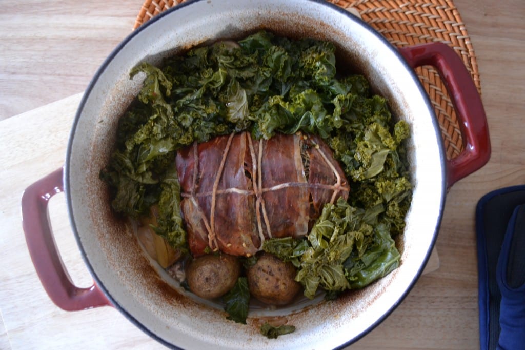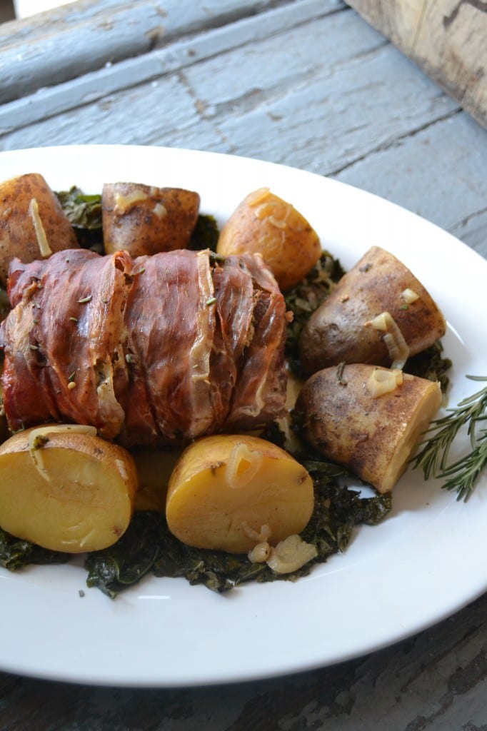 When the roast is done, let it rest for at least 10 minutes before cutting into it. Cut a tiny slit in the crispy prosciutto crust and slide out the sprigs of rosemary.