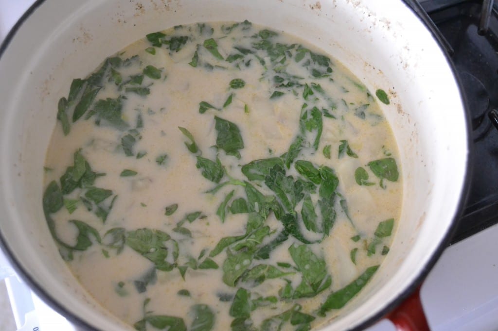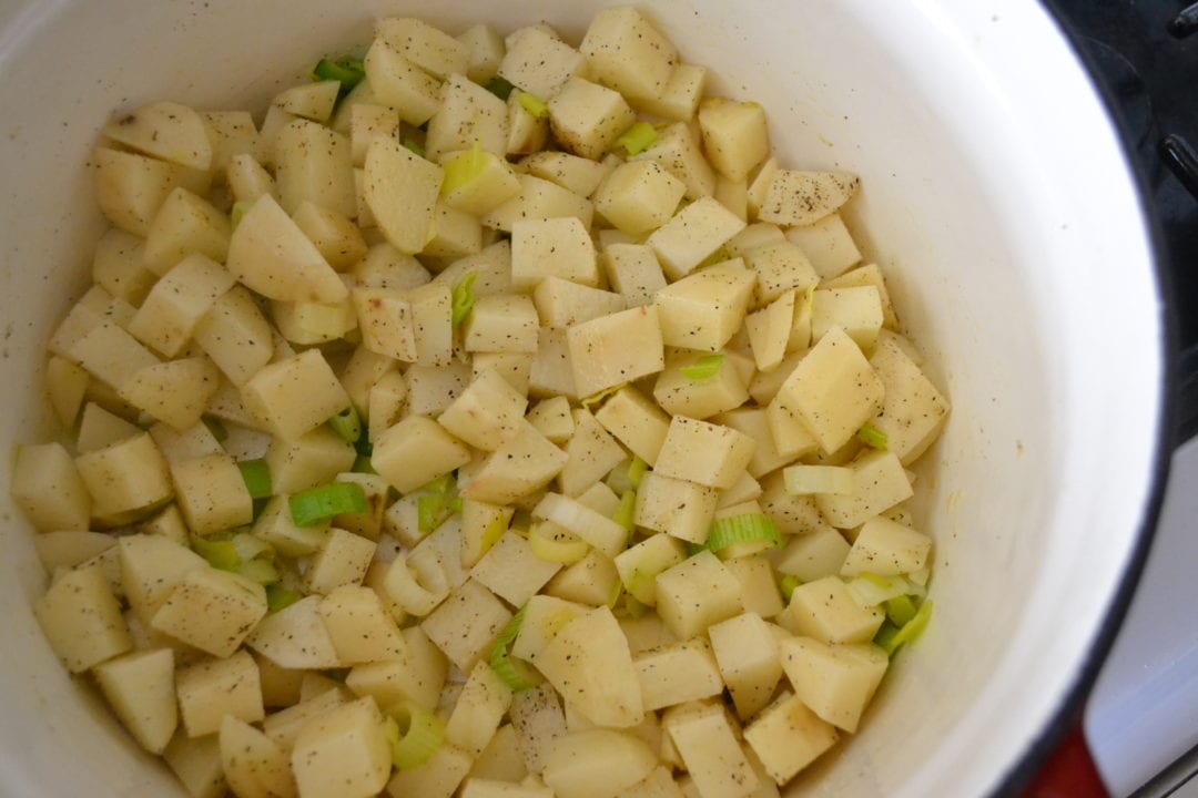 Add the potatoes to the pot and sauté them for five minutes. Pour in the unsweetened almond milk. Cook leeks, potatoes, and garlic for twenty to twenty five minutes.