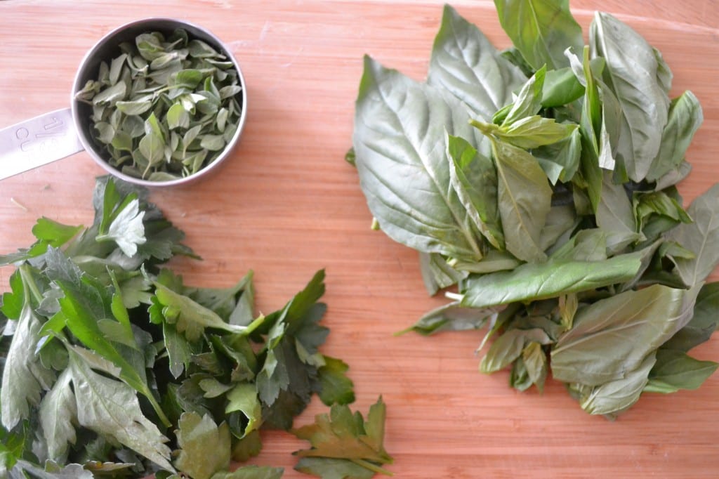 Roughly chop the basil, parsley, and oregano. Add the herbs to the pot.