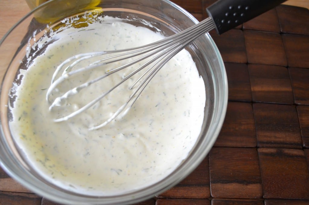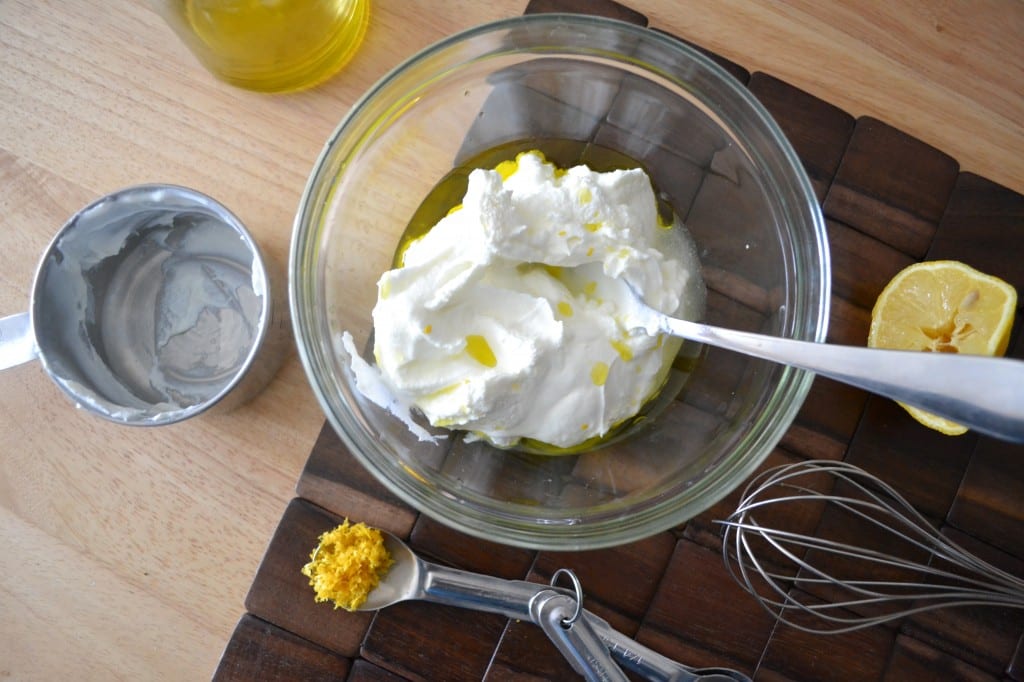 In a medium bowl combine the greek yogurt, olive oil, lemon juice, and lemon zest. Whisk all ingredients together.