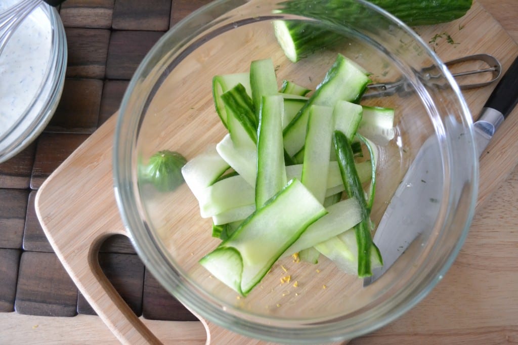 Wash the cucumbers then cut them in half width-wise. Using a vegetable peeler, start peeling the cucumber halves into thin, long ribbons. Place the ribbons in a large bowl.