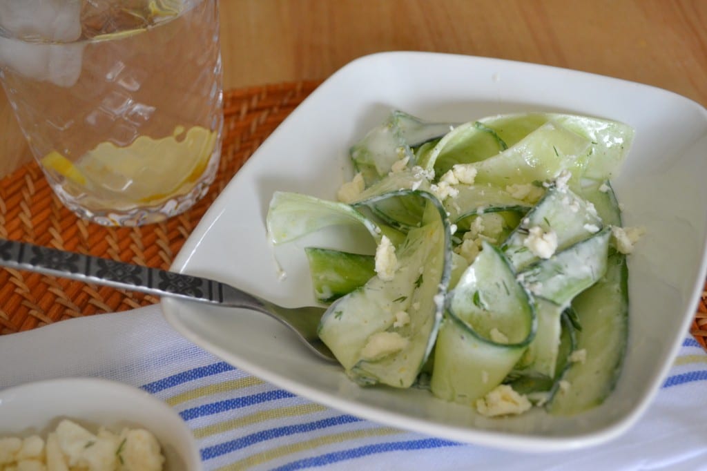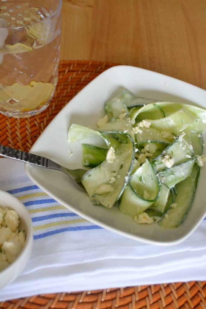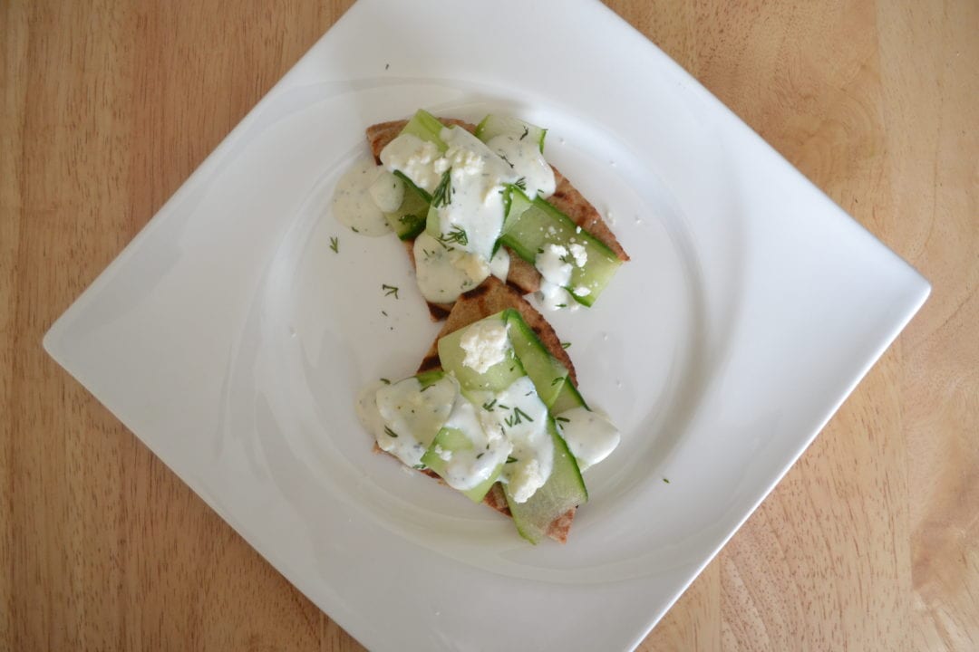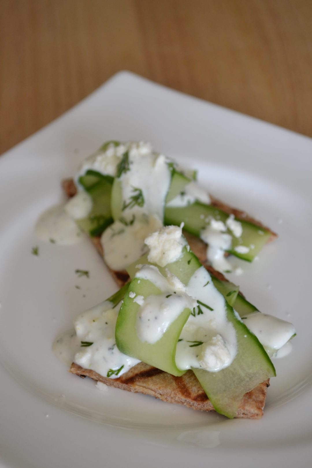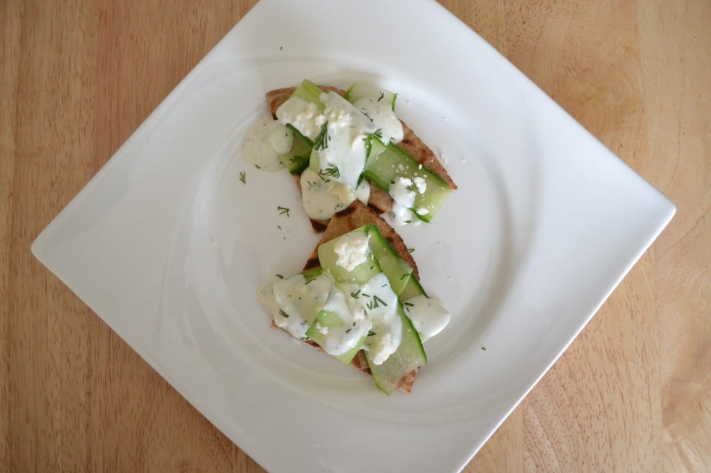 Or if you want to be fancy, you can toast or grill some pita bread, make a little pile of cucumber on top, then drizzle with the dressing, and finish with a sprinkle of feta cheese and a little fresh dill.