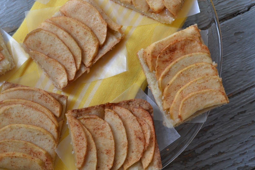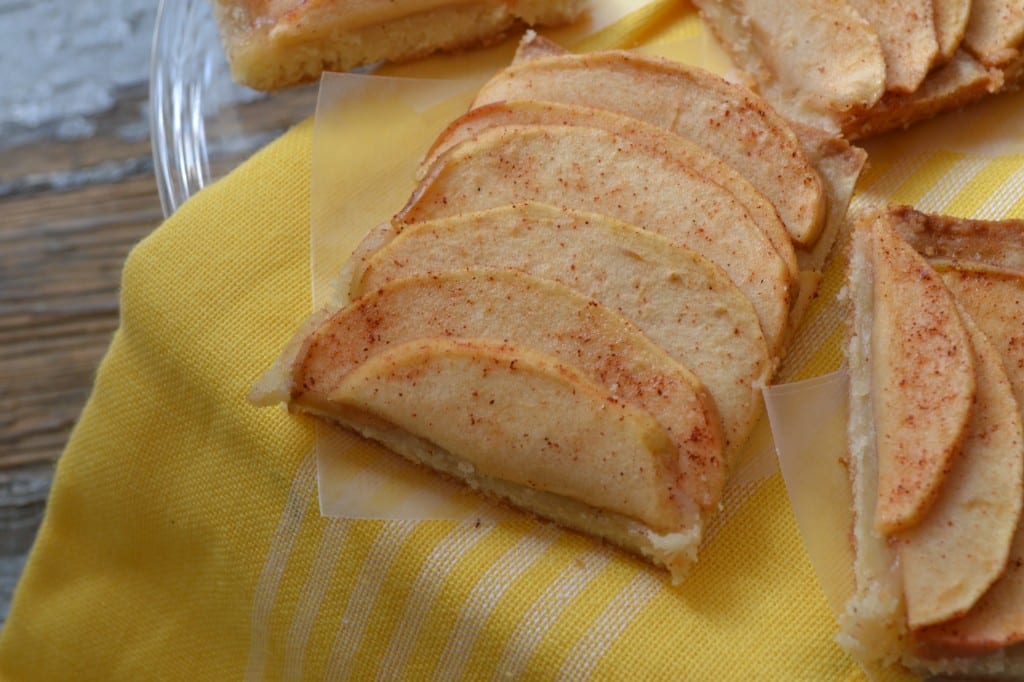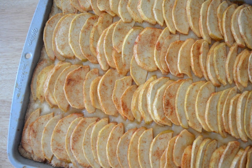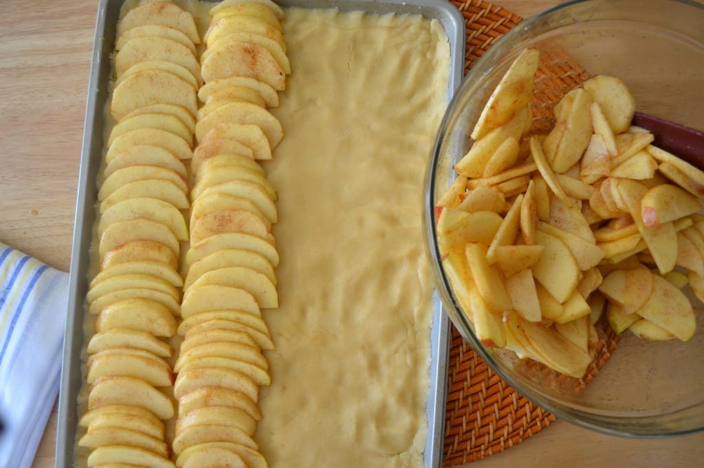 Spread on buttered cookie sheet (15×10). Mix sugar with the cinnamon. Then mix in the apple slices. Arrange the apple slices on top of dough.