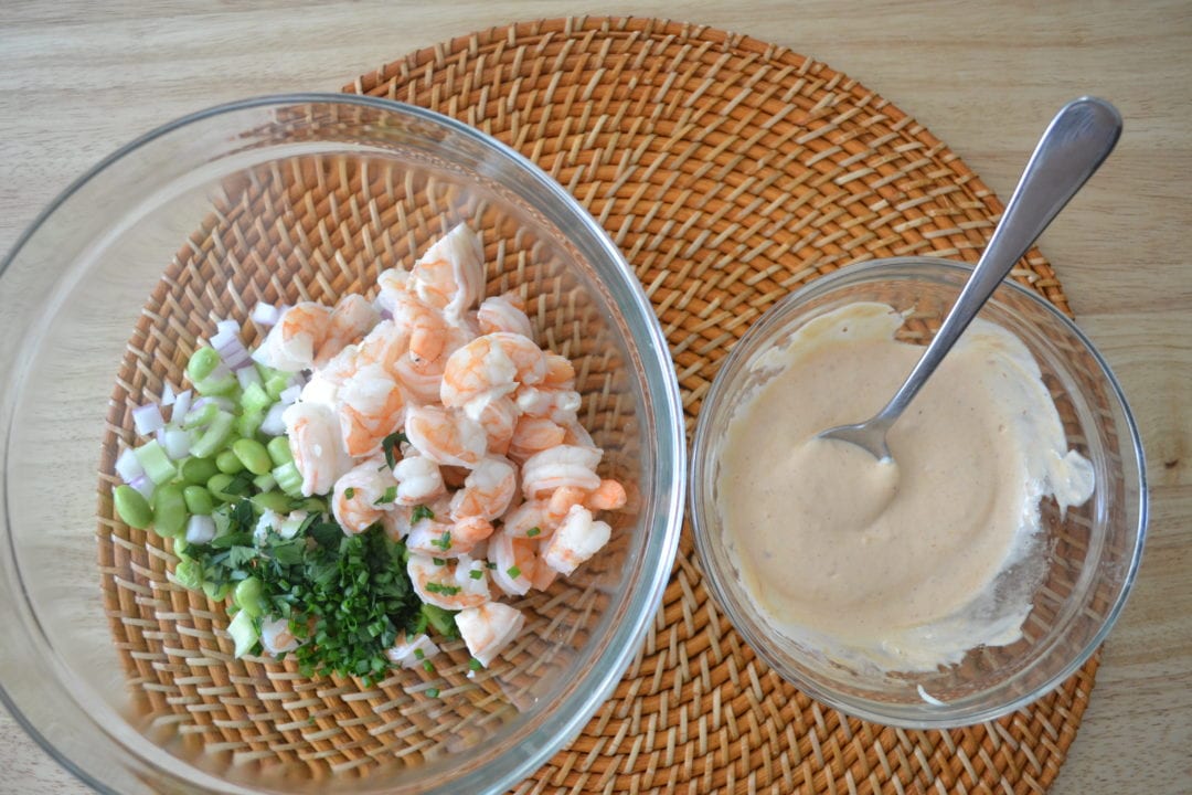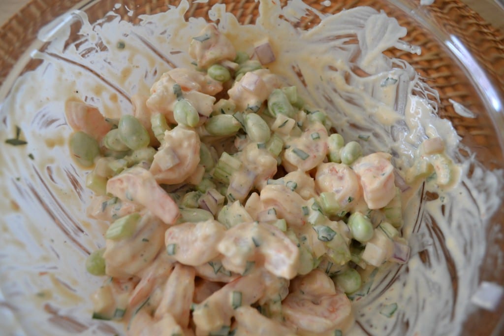 Place shrimp, celery, red onion, edamame, parsley, and chives in a bowl. Whisk together in a small bowl the sesame oil, lemon juice, ginger, sriracha, cocktail sauce, mayo, salt, and pepper.