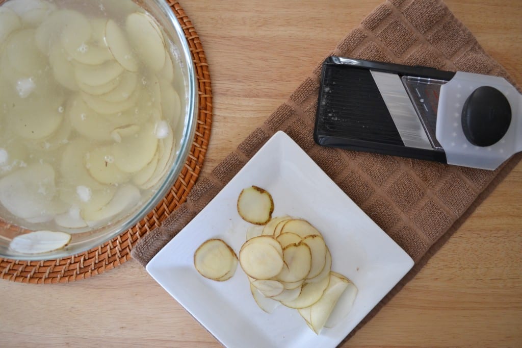 Preheat the oven to 450 degrees. Slice the potato using a mandolin. The thinnest slice setting is the best for these little crispy guys.