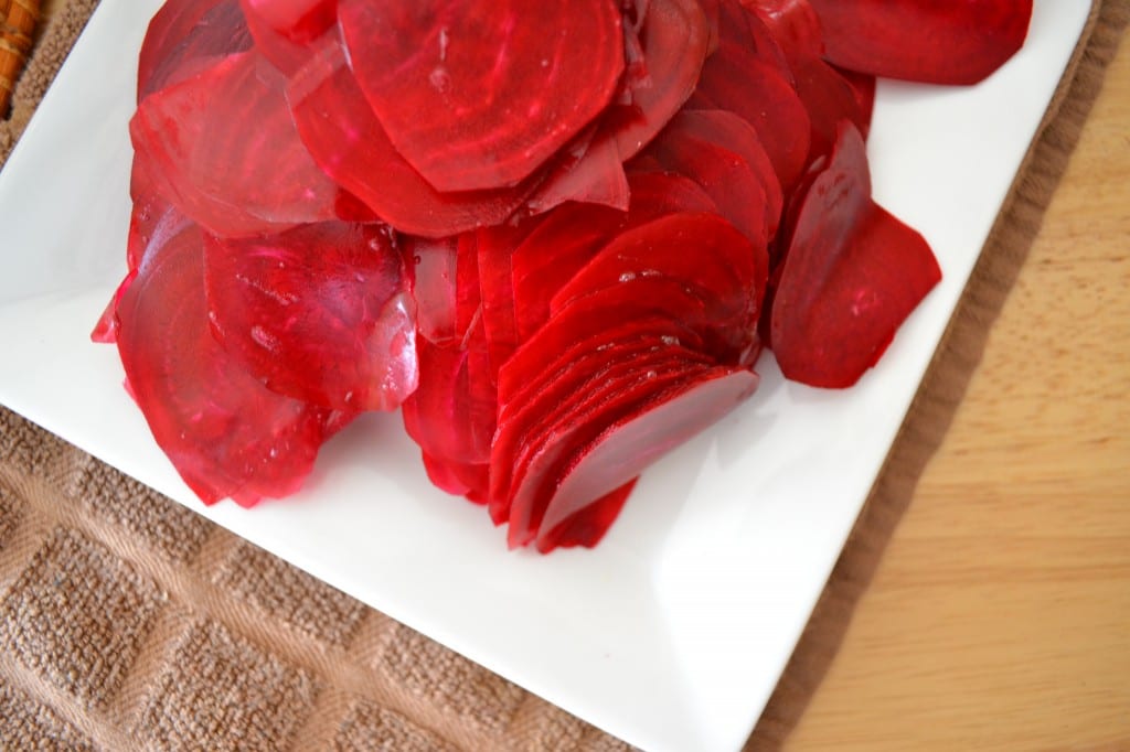 Turn the oven down to 350 degrees. Slice the beet using the medium thinnest slice setting on a mandolin. Arrange the beet chips on a large baking sheet, coat in olive oil, season with salt and pepper, and bake in the oven for 20 minutes. You want a little bit of bite or chew to these chips.