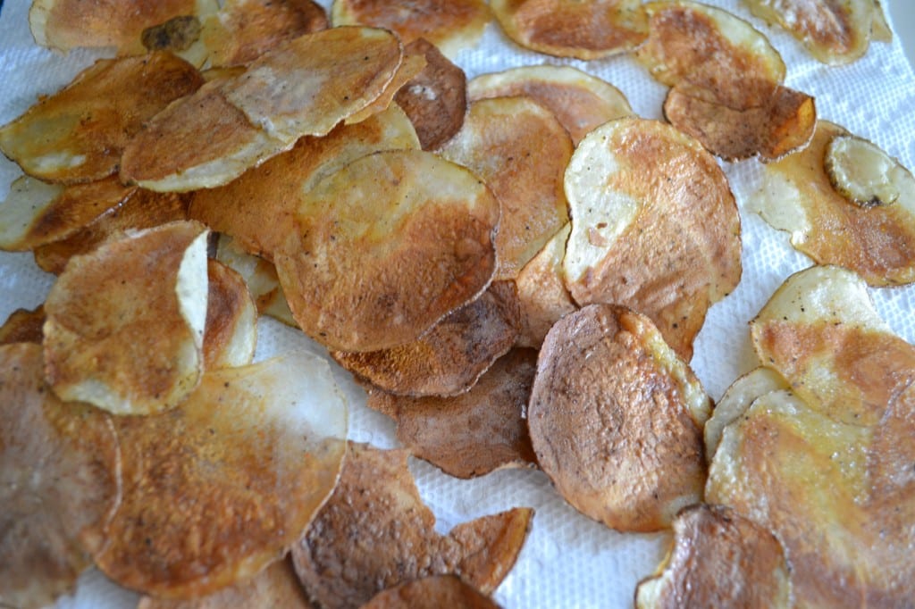 Arrange the potatoes in one layer, making sure no slices are overlapping. You might need two baking sheets depending on the size of your largest baking sheet. Bake the potatoes for 30 minutes until golden and crispy. When done, let the chips cool and drain on a few paper towels.