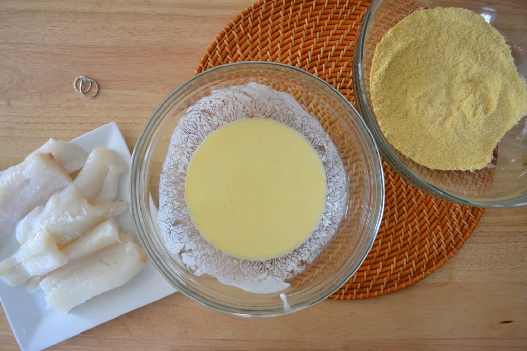 While the oil heats, cut the cod into fourths. Whisk the egg and buttermilk together in a medium bowl. In a separate larger bowl, combine the salt, pepper, cayenne, cornmeal, and corn starch. Mix together using a whisk.
