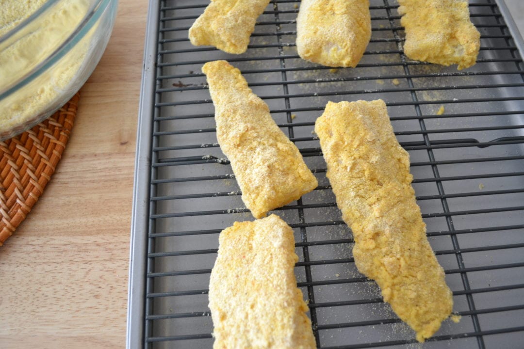 Dip each piece of fish in the buttermilk egg mixture and then dredge in the cornmeal mixture. Place the breaded fish on a wire rack to set before frying.