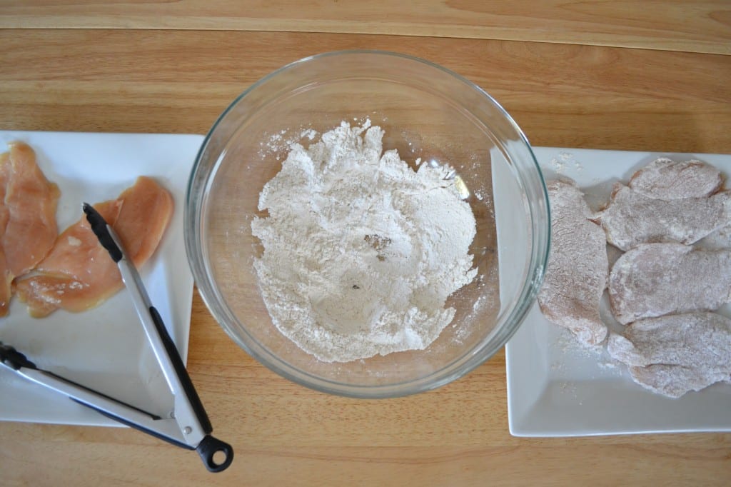 While the oil heats up, lightly coat the chicken breasts in the flour mixture, then place on a wire rack until ready to cook.