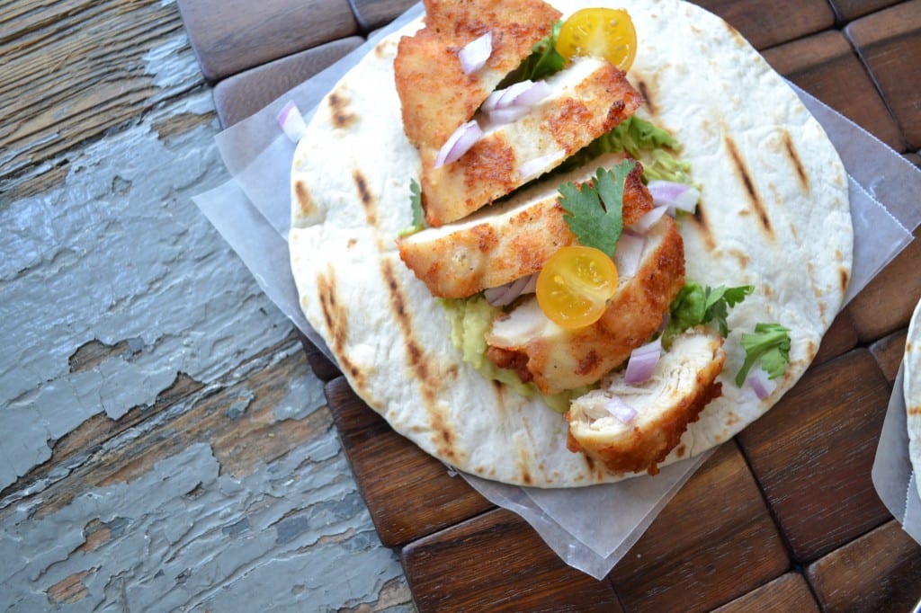 Scoop half of an avocado onto a tortilla. Smash using a fork. Top with sliced crispy chicken, some red onions, jalapenos, and some fresh cilantro leaves.