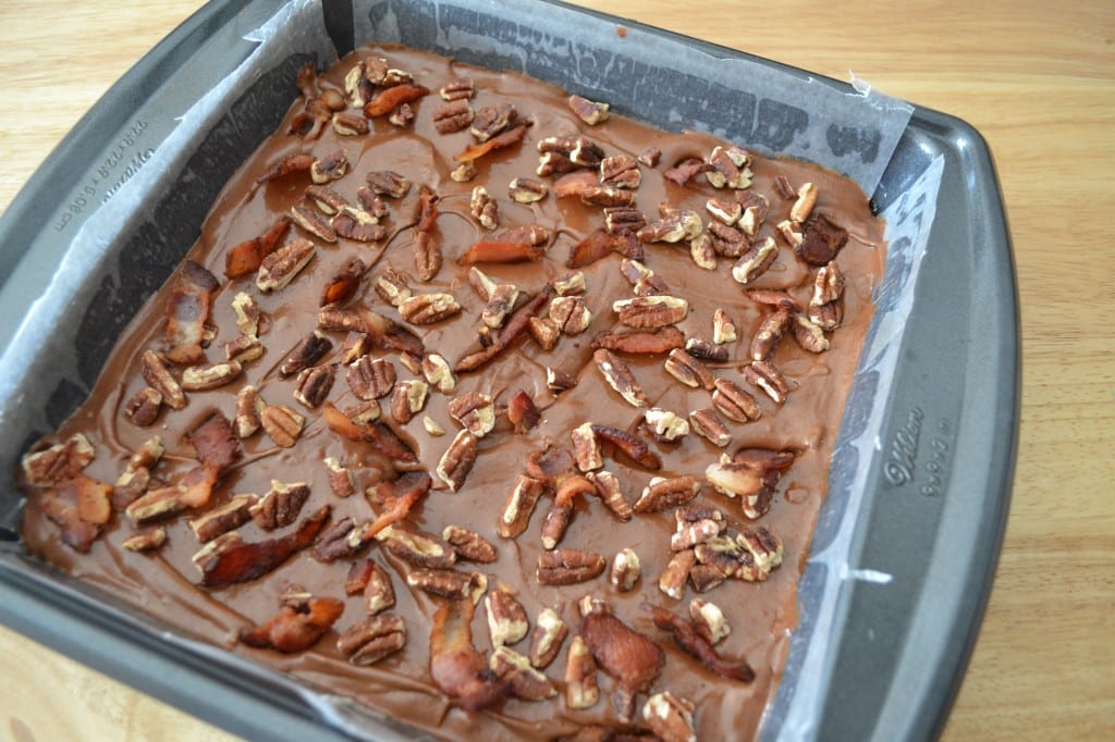 Scrape the batter into the prepared pan and sprinkle the bacon and pecans on top. Bake for about 50 minutes, until the brownies are set around the edges but slightly wobbly in the center; a toothpick inserted into the center should have some batter clinging to it. Transfer the pan to a rack and let the brownies cool completely. Lift the brownies out of the pan using the parchment paper. Cut into squares and serve.