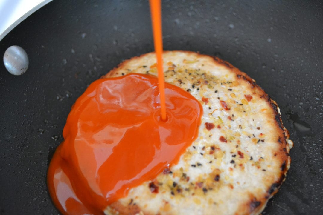 Add the burgers to the skillet. Cook for two minutes on each side. Then pour the buffalo sauce on top of each burger patty. Make sure to slightly lift the burgers to get the sauce under each patty. Place a lid on the pan and cook for six minutes. The sauce is going to caramelize around each burger.