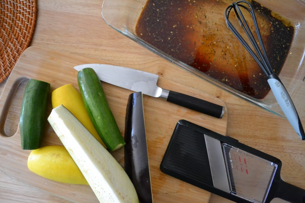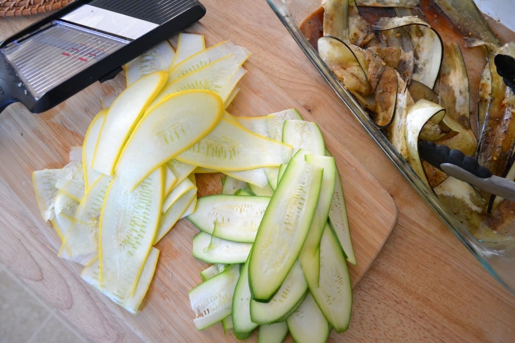 Cut the ends off the eggplant, zucchini, and squash. Set your mandolin on the second thinnest setting. Start by slowly and carefully gliding the eggplant along and through the blade. Make sure to get as long of a slice as possible. Continue slicing using the mandolin until all two quarters of the eggplant have been sliced. Place the eggplant slices in the marinade.
