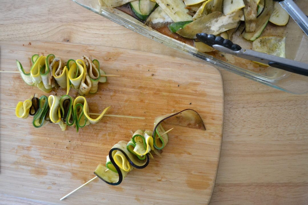 Once all vegetables have been skewered, place them back in the marinade until you are ready to grill. Vegetables can last a day in the fridge.