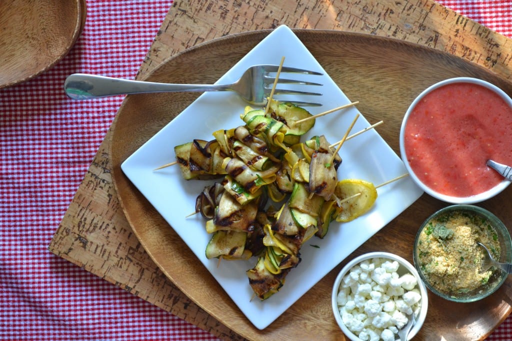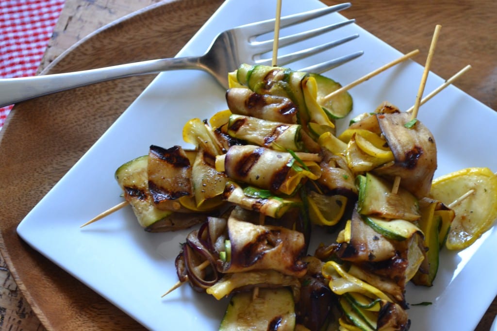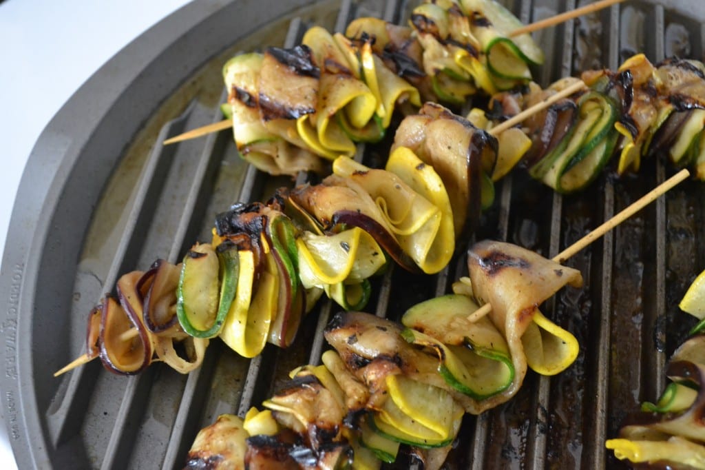 Heat the grill or grill pan for a few minutes over medium heat. Lightly oil up the grates before you add the veggies. Place the skewers on the grill with the bigger looped side down. Grill for seven minutes on each side, flipping once.