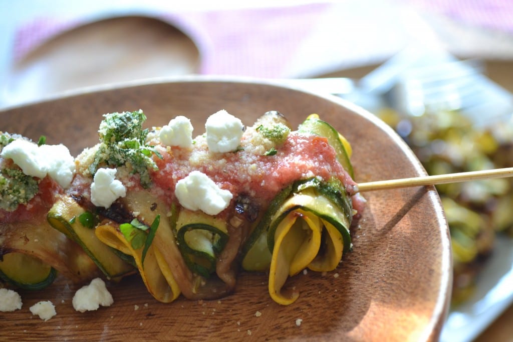 For the true ratatouille experience, top the hot skewer with tomato puree, breadcrumbs, and then the goat cheese.