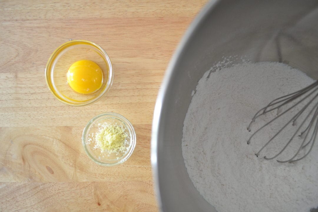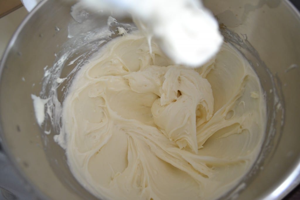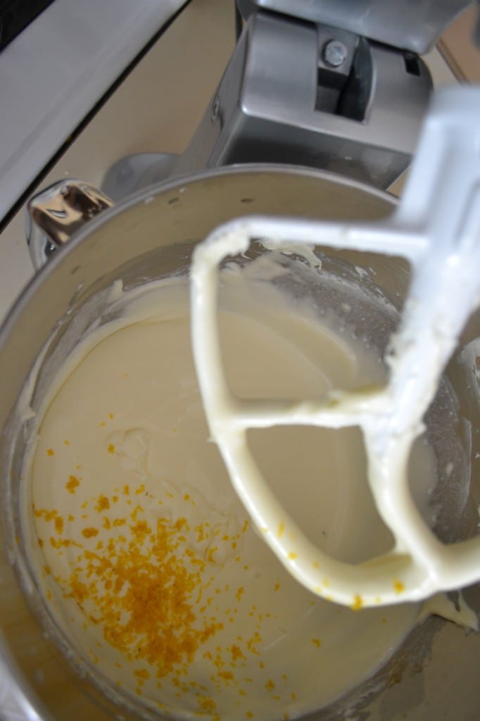 Add the heavy cream and mix at medium speed until glossy and creamy, about three minutes. Add the fresh lemon zest and mix for another minute.