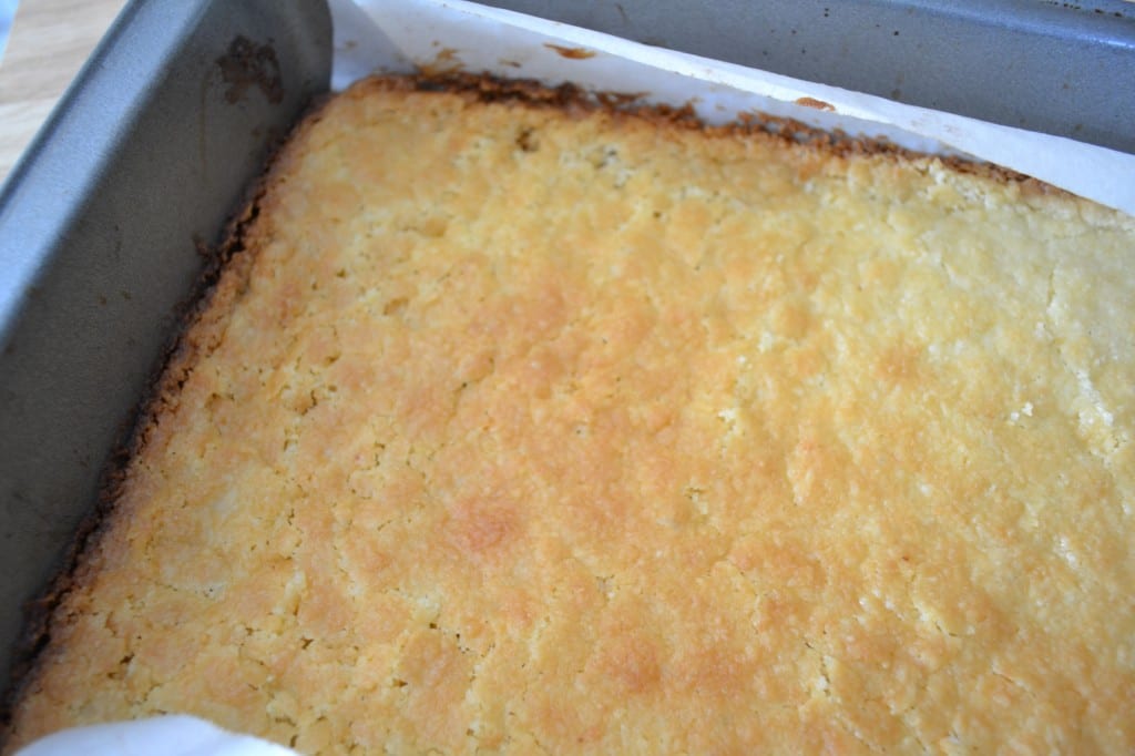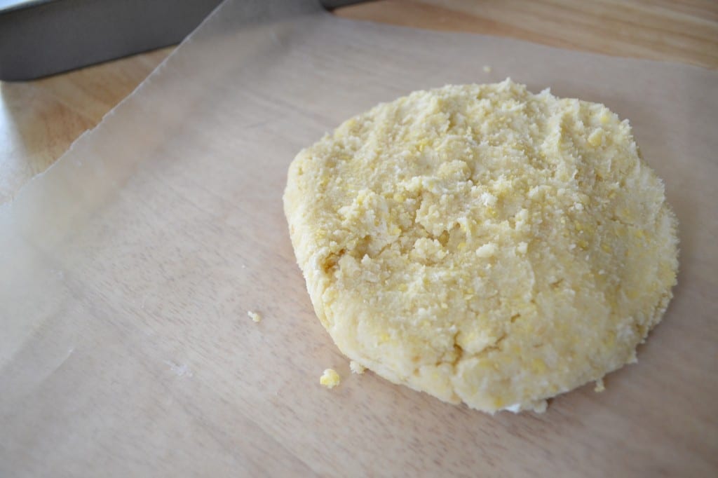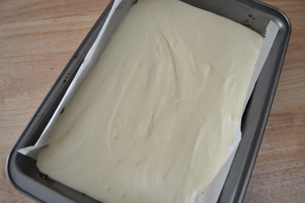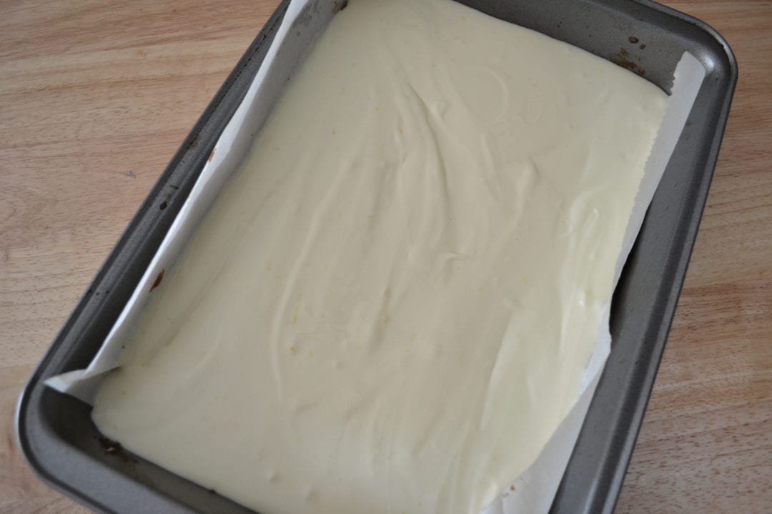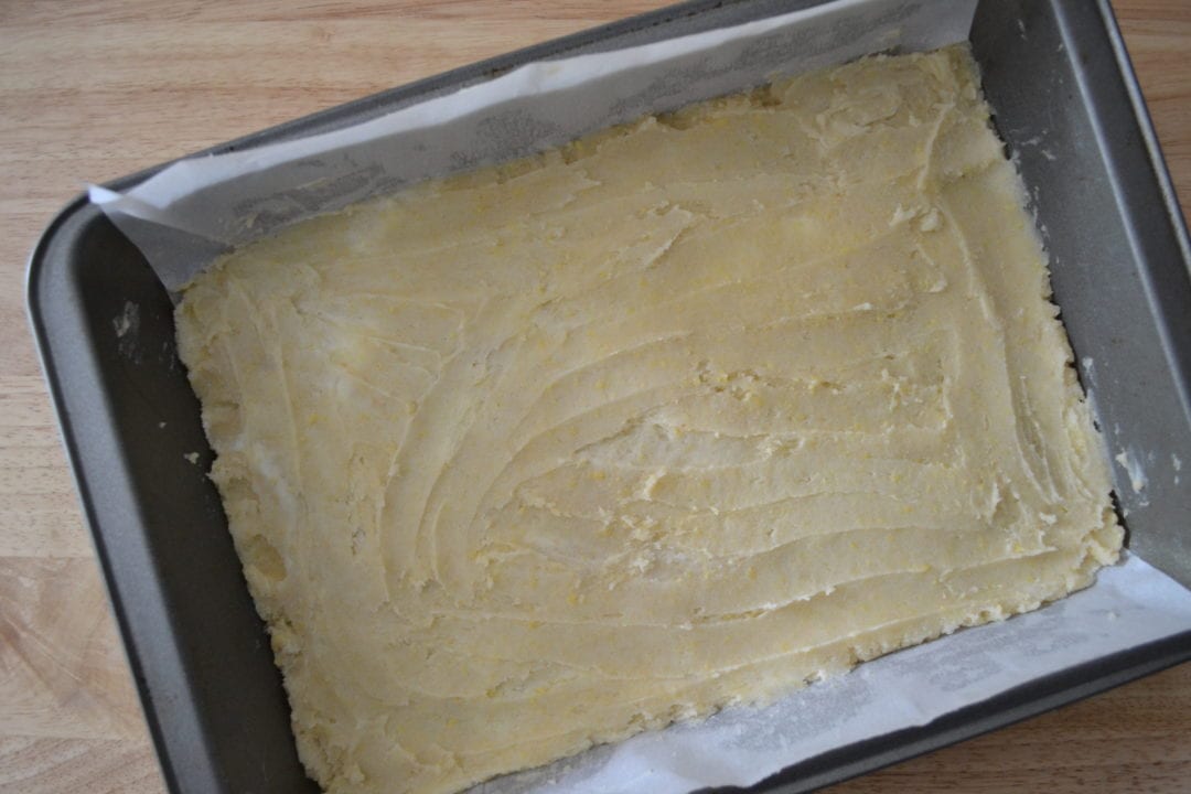 After an hour, roll the dough out into a small rectangle shape between two pieces of parchment paper. Line a 9 x 13 inch baking pan with parchment paper. Flip the dough over into the lined pan. Press the dough into the corners of the pan. Work quickly because the dough will start to get stickier and stickier as it warms.