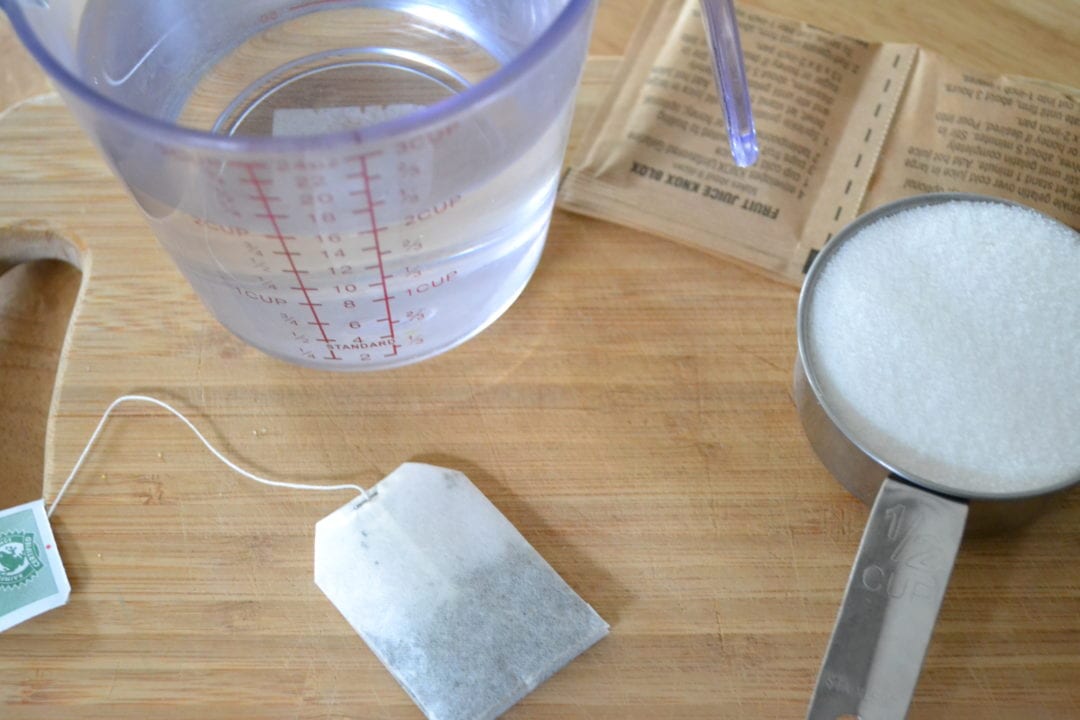 After the tea bag has steeped for five minutes, add the sugar and blueberries. When the sugar has completely disintegrated, add the gelatin packets to the pot. Mix to combine.