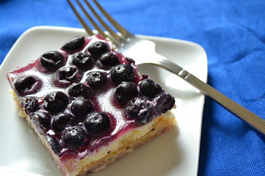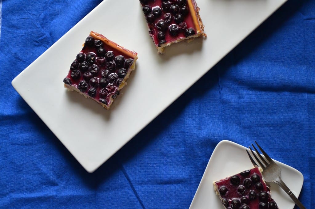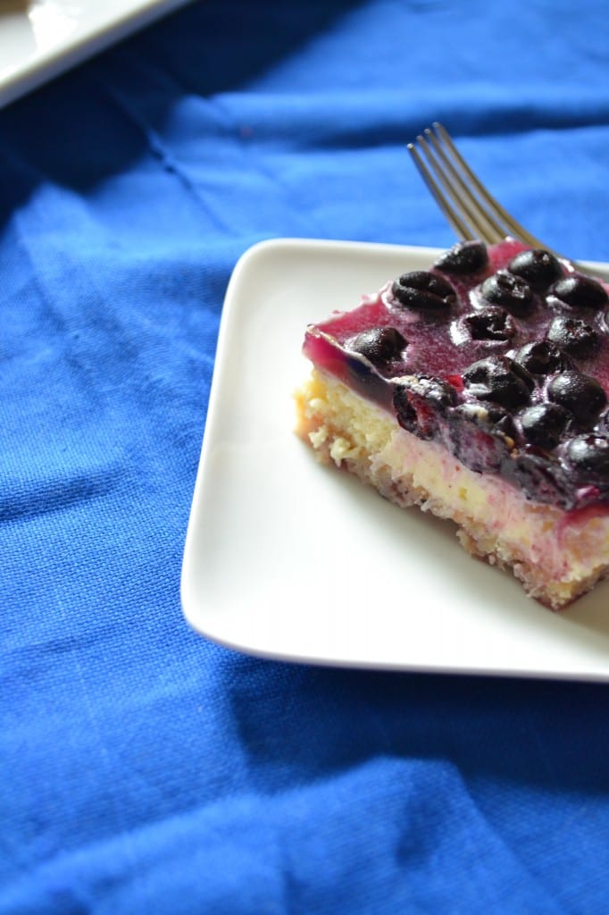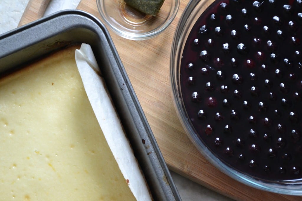 When the cheesecake layer is cool, pour the blueberry green tea layer on top. Refrigerate for at least four hours, but overnight is best.
