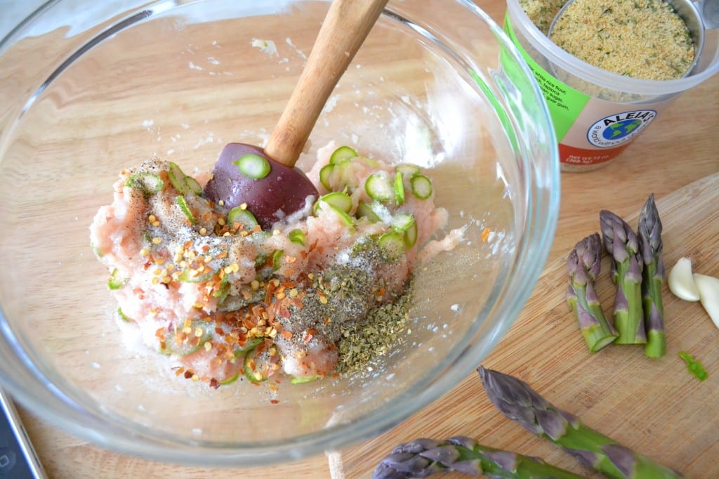 In the meantime, combine the ground chicken, thin asparagus discs, egg, garlic, salt, pepper, crushed red pepper, oregano, gluten-free Italian breadcrumbs, and parmesan cheese in a medium mixing bowl.