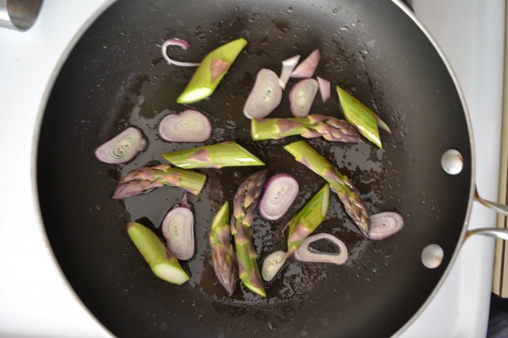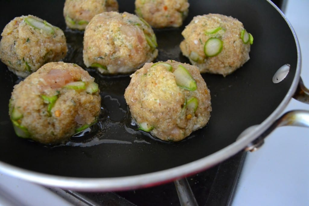 Sauté the asparagus tops and sliced shallot in the same pan you used for the meatballs. Sauté asparagus and shallot for five minutes over medium heat. Remove the asparagus and set on the side for later. Add the grated garlic and sauté for two more minutes over low heat.