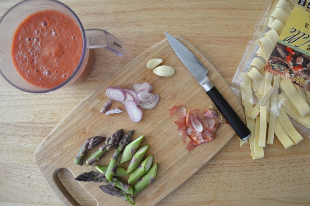 Note: Reserve the tops of the spears for garnish or to add into the tomato sauce later.