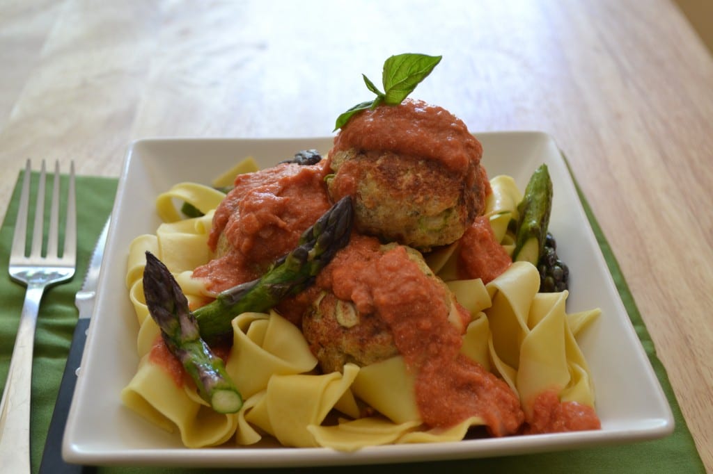 At this time, the meatballs should be done. Serve the meatballs alone with the sauce and the asparagus for a healthy gluten-free option.