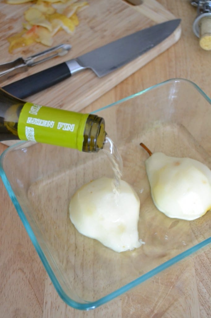 Peel the pear and then slice it in half. Place the pear cut side down in a Pyrex or oven-safe baking dish. Pour the white wine into the dish.