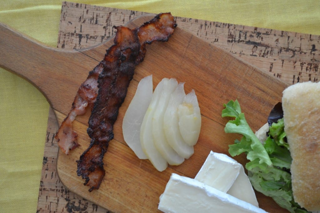 Thinly slice each pear half, making sure not to include the seeds. Place half of the pear slices on top of the bacon on each sandwich. Top with the brie cheese and the other half of the ciabatta roll.