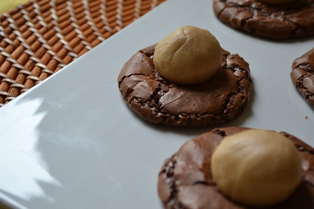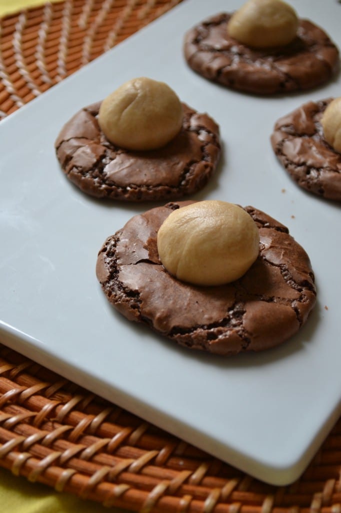 Bake cookies for ten minutes. Remove from oven and immediately press a peanut butter ball into the center of each cookie. Cool the cookies on the baking sheets for ten minutes. After ten minutes, transfer cookies to a wire rack to cool completely.