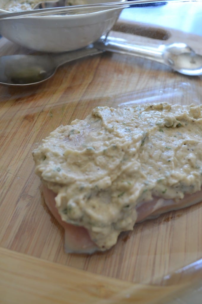 Drizzle a little bit of olive oil into the bottom of an oven-safe dish. Place the chicken breasts into the dish. Dollop one to two tablespoons of the bean and herb mixture on to each chicken breast. Smooth the mixture out so it covers the whole top of the chicken breast evenly. Place the dish with the chicken breasts in the oven and bake for twenty minutes.