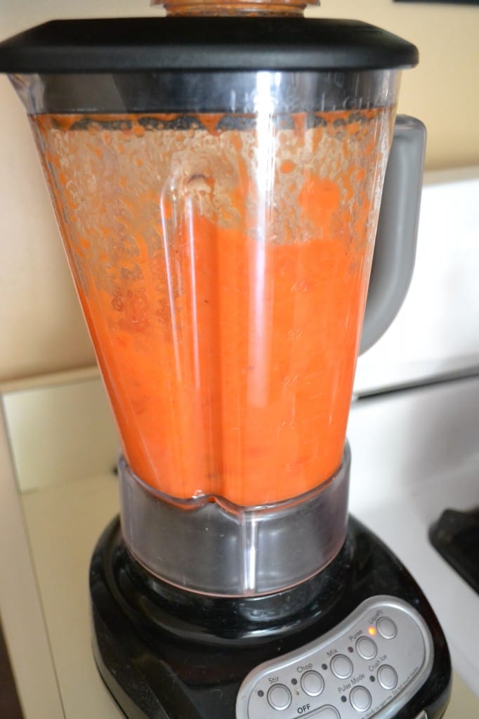 Add the jar of roasted red peppers plus liquid, water, salt, and pepper to a blender. Blend until the entire mixture is liquefied, about two minutes.
