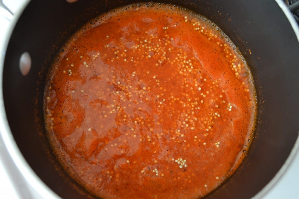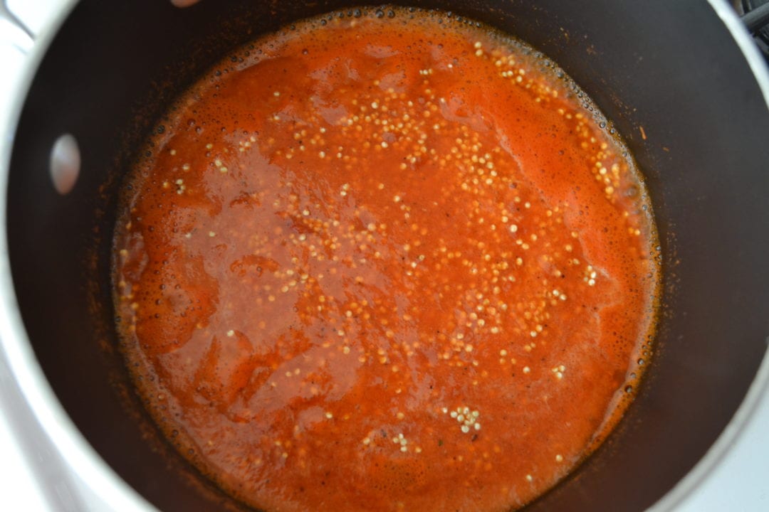 Add the roasted red pepper liquid along with the quinoa to a medium saucepan. Bring to a simmer over medium heat. Once the liquid comes to a simmer, knock the heat back to low and cover with a lid. Cook for fifteen minutes until the liquid is absorbed. Look at that red quinoa!