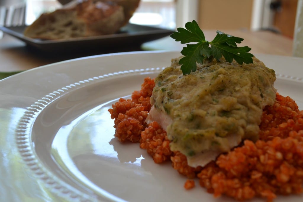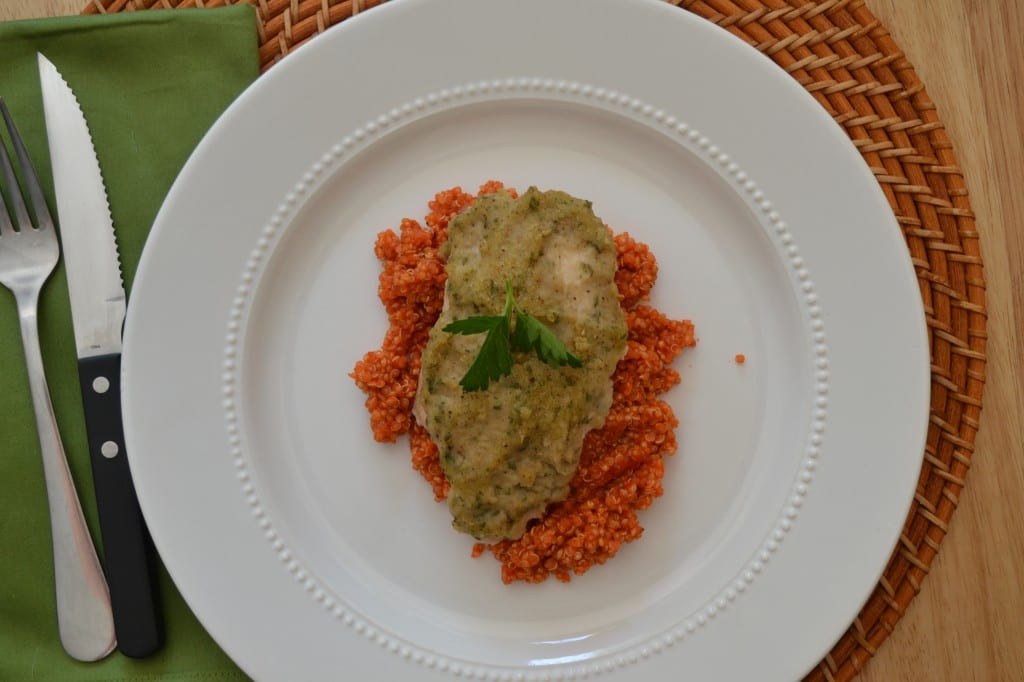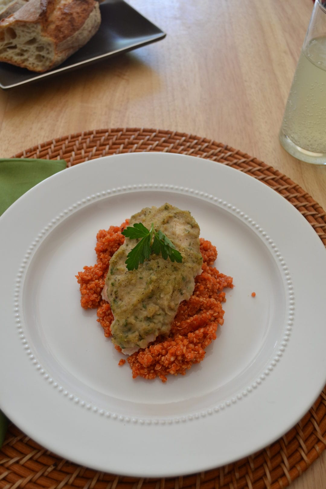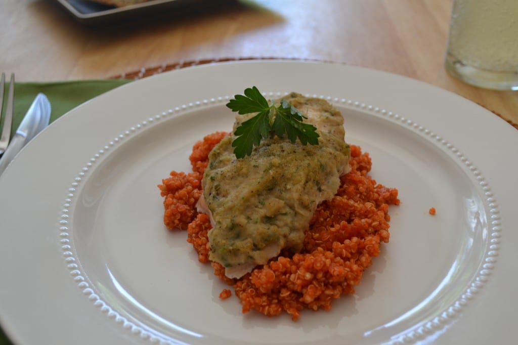 The quinoa should finish right around the time the chicken is done. Remove the chicken from the oven. Place a large spoonful of the quinoa on a plate and place a chicken breast on top of that.