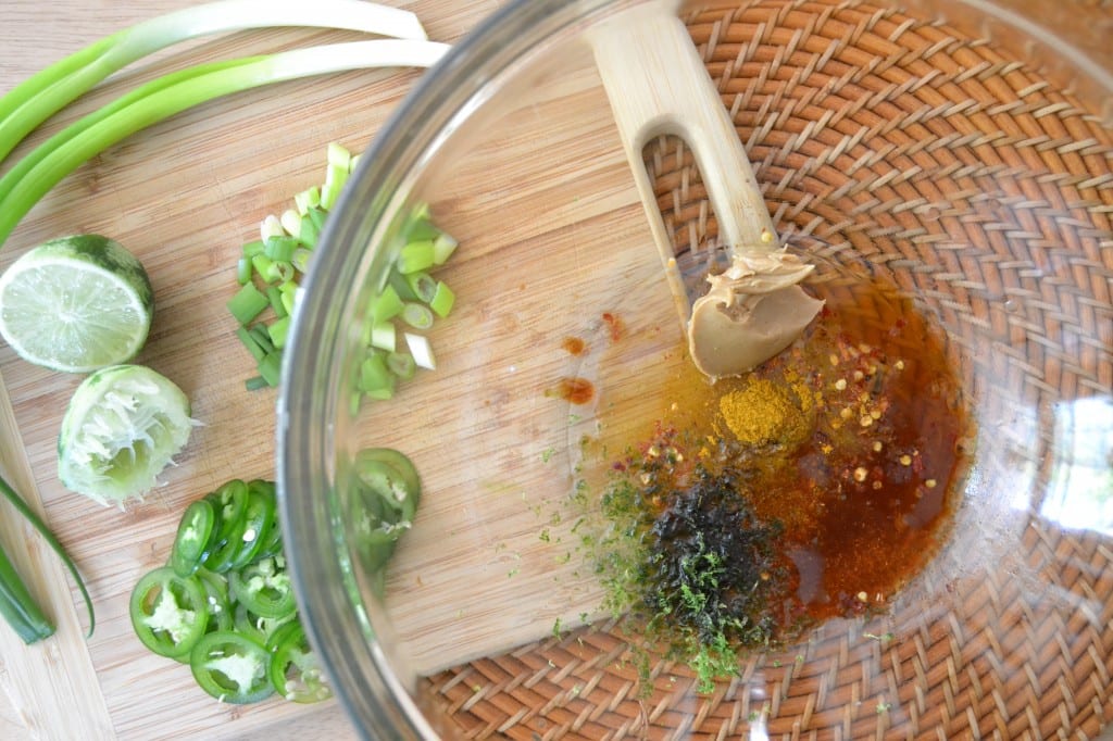 Pop the bowl containing all the ingredients for the dressing into the microwave for twenty seconds. This will melt the peanut butter a bit and make it easier to work with. Whisk to combine. Set on the side.