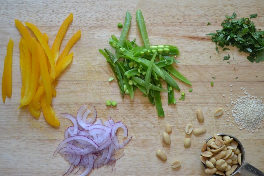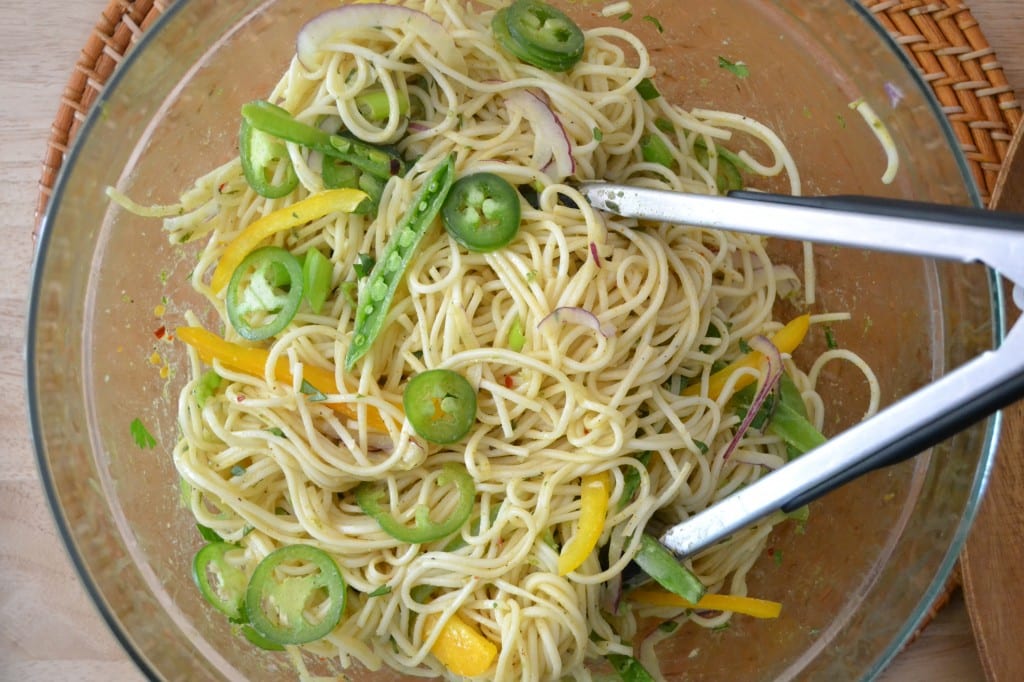 While the noodles continue cooling, chop all the vegetables and then toss them into the large bowl with the dressing.