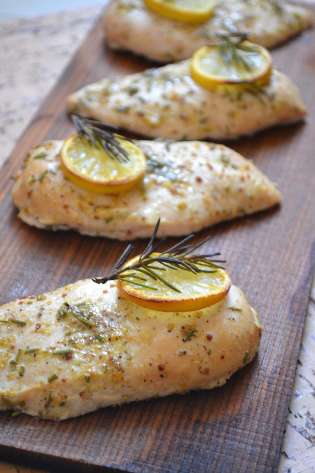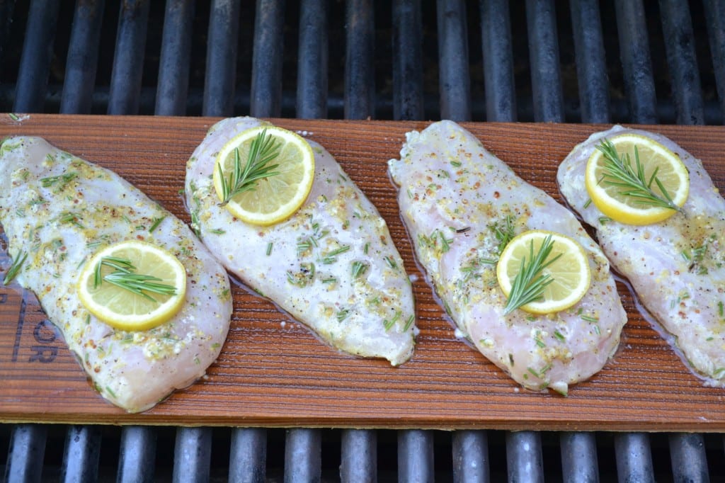 - Place a lemon slice and piece of rosemary on each chicken breast. Add plank to grill. Close lid and grill for 20-25 minutes until internal temperature reaches 165 degrees F.