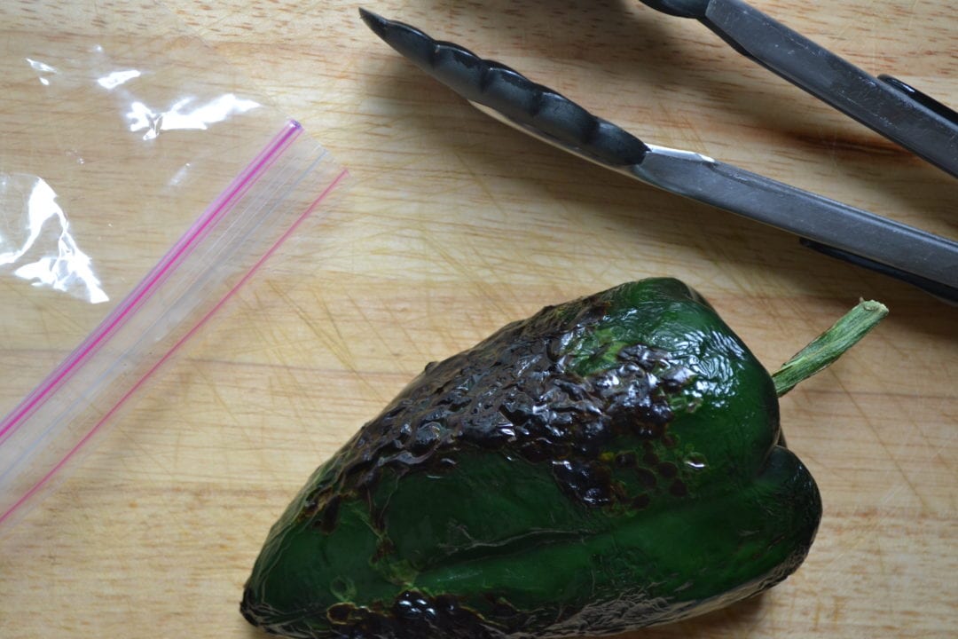 After you roast the pepper, place it in a plastic bag and seal it. Let the pepper steam in the bag for fifteen minutes. When the time is up, the skin should easily peel off.