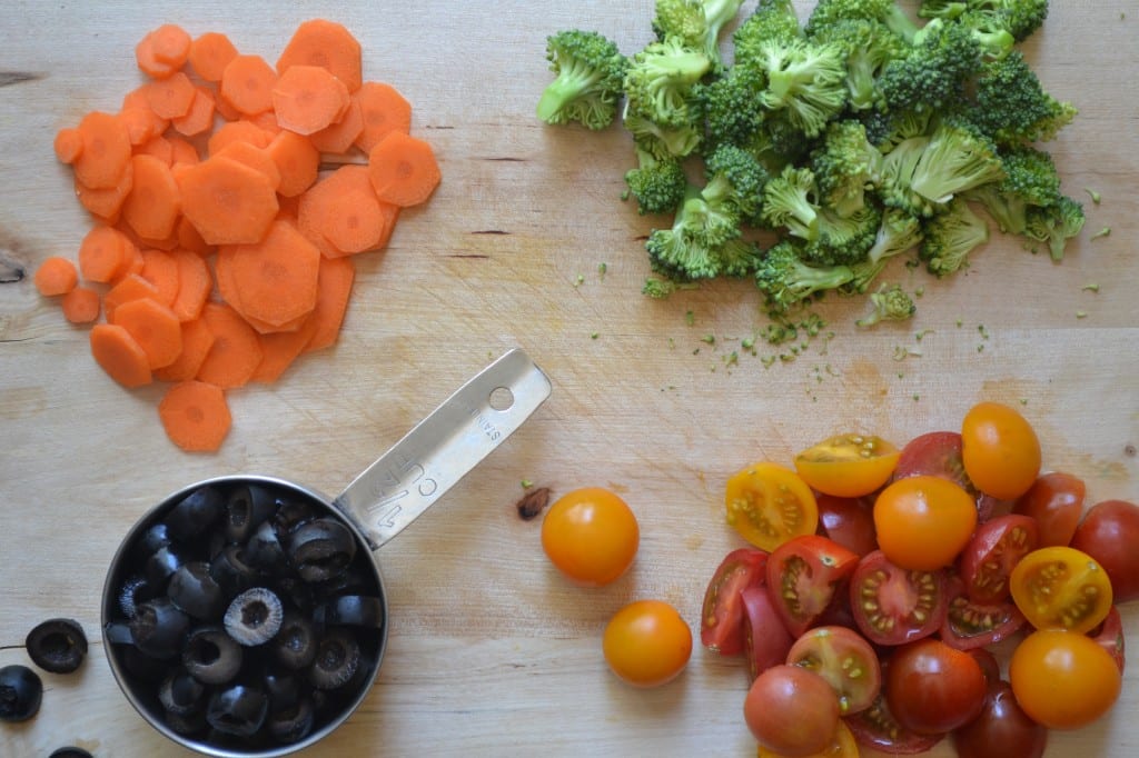 Prepare the vegetables. Peel a large carrot and then thinly slice it. Cut each cherry or grape tomato in half or fourths, whichever you prefer. Drain the canned black olives, measure out a half a cup, and set on the side.