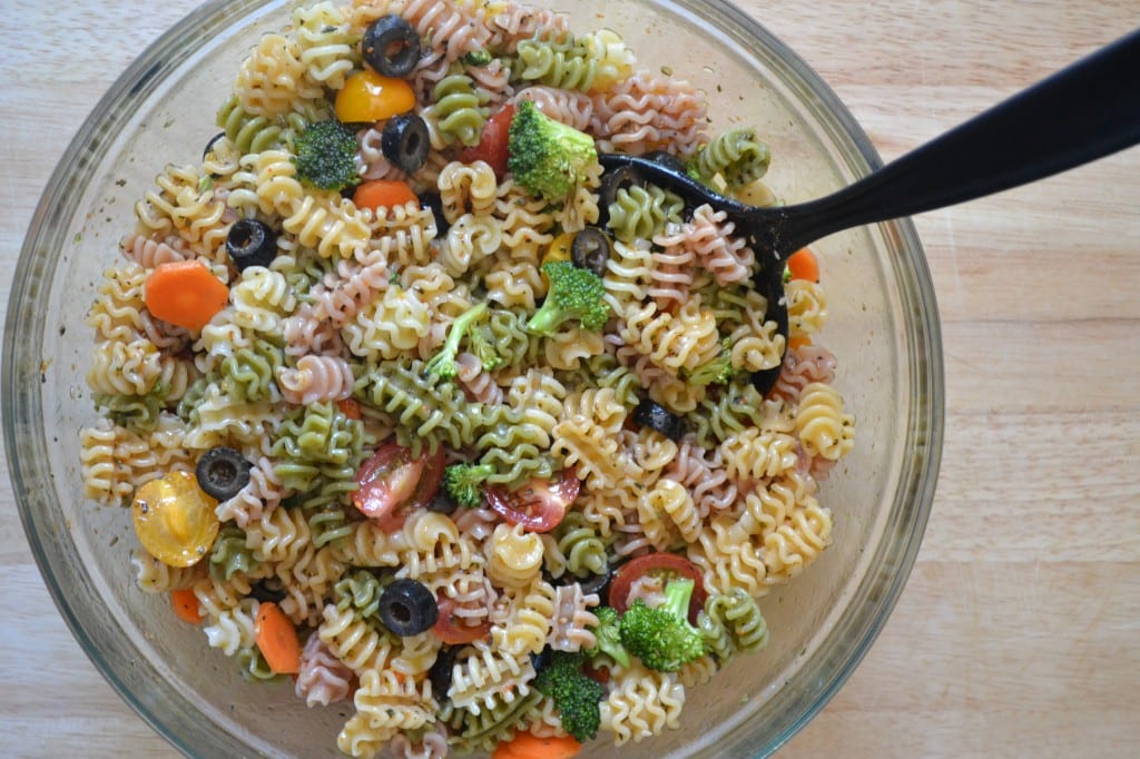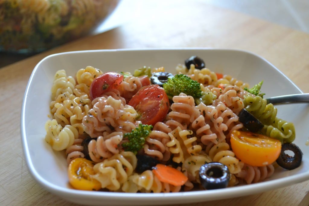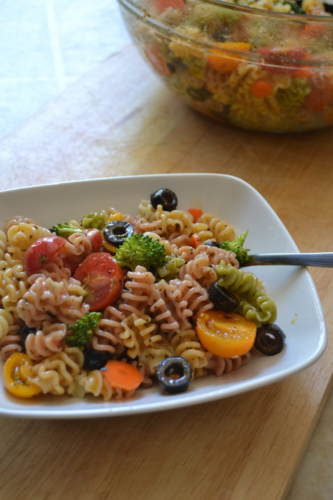 Add the vegetables and pasta to the bowl with the dressing in it. Mix well. Serve immediately or place in the refrigerator until you are ready to serve it. The pasta is best served at room temperature and will last under refrigeration in a sealed container for up to two weeks.