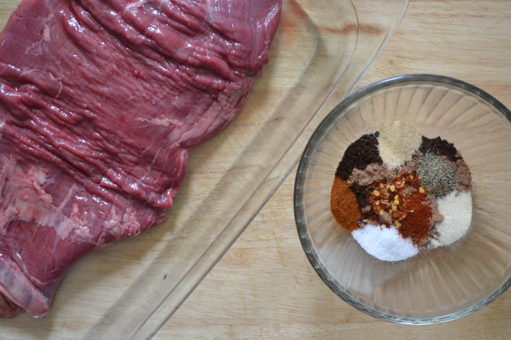 In a small mixing bowl, combine all of the dry spices for the rub. Whisk to combine. Coat the entire flank steak with the seasonings. Rub the seasonings into the steak.
