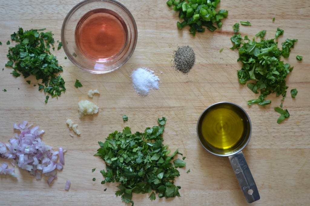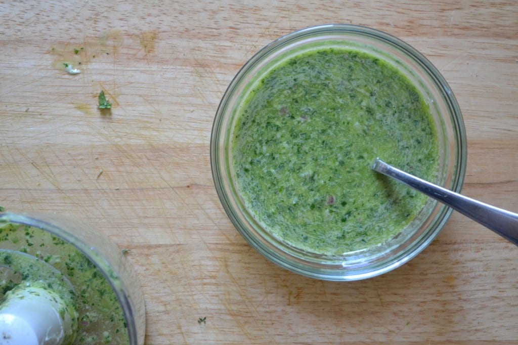 While the meat rests, add all of the ingredients for the dressing to a food processor. Puree until smooth, about two minutes. If the dressing is a little too chunky for you, add a drizzle of olive oil.