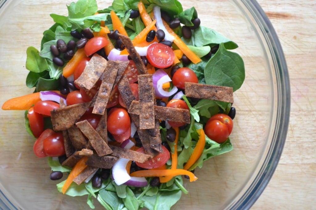Whatever vegetables you would like for the salad plus some crushed tortilla chips on top!