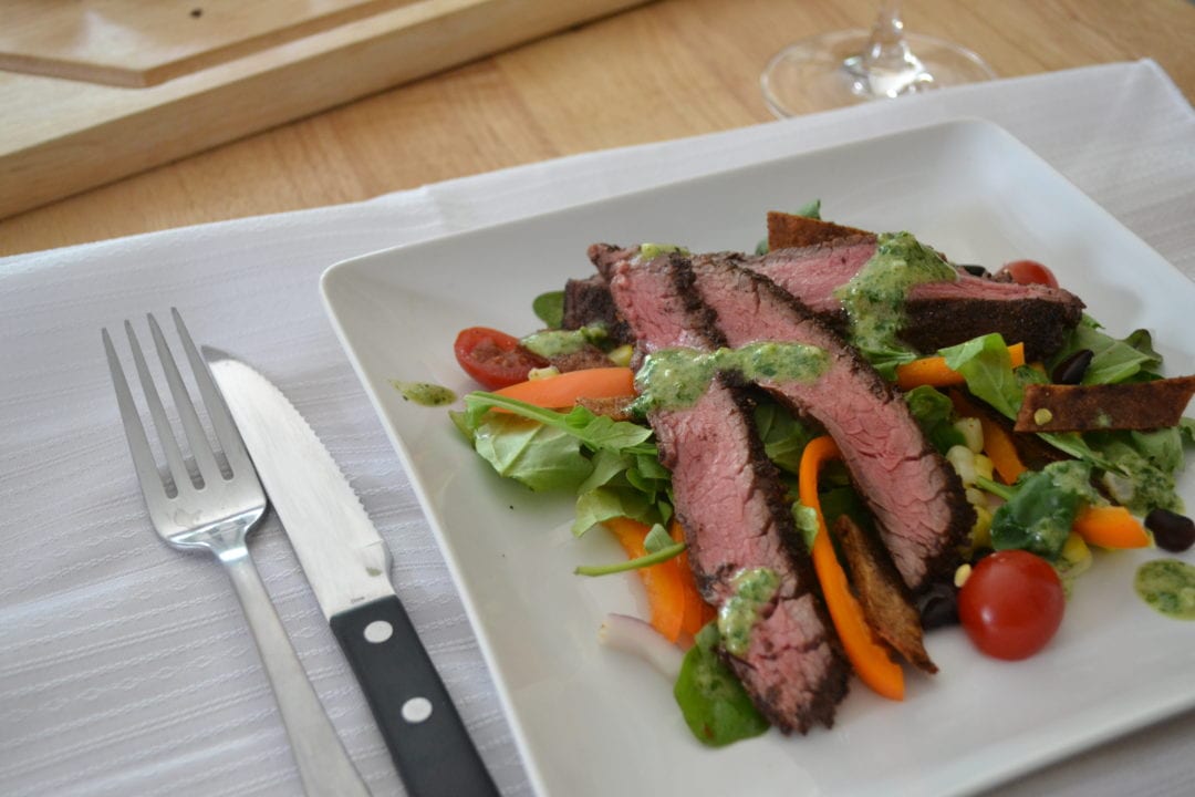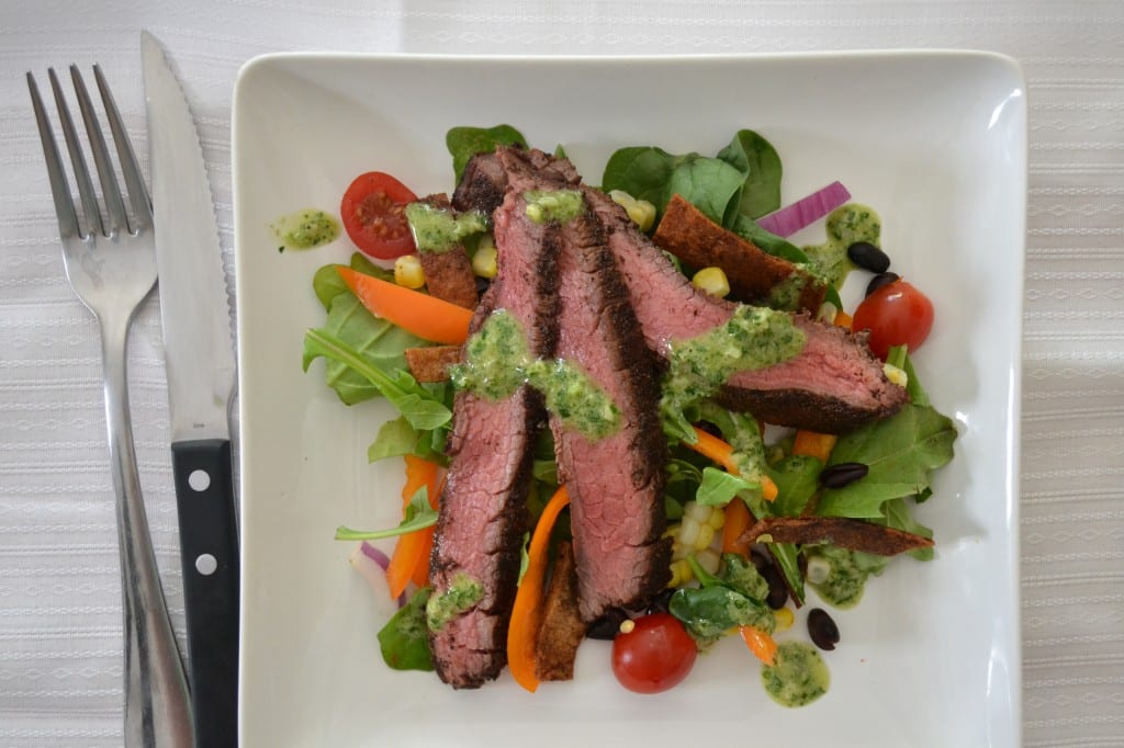 Using a sharp knife, thinly slice the flank steak. Serve the salad in a large bowl topped with the steak and dressing or individually plated.
