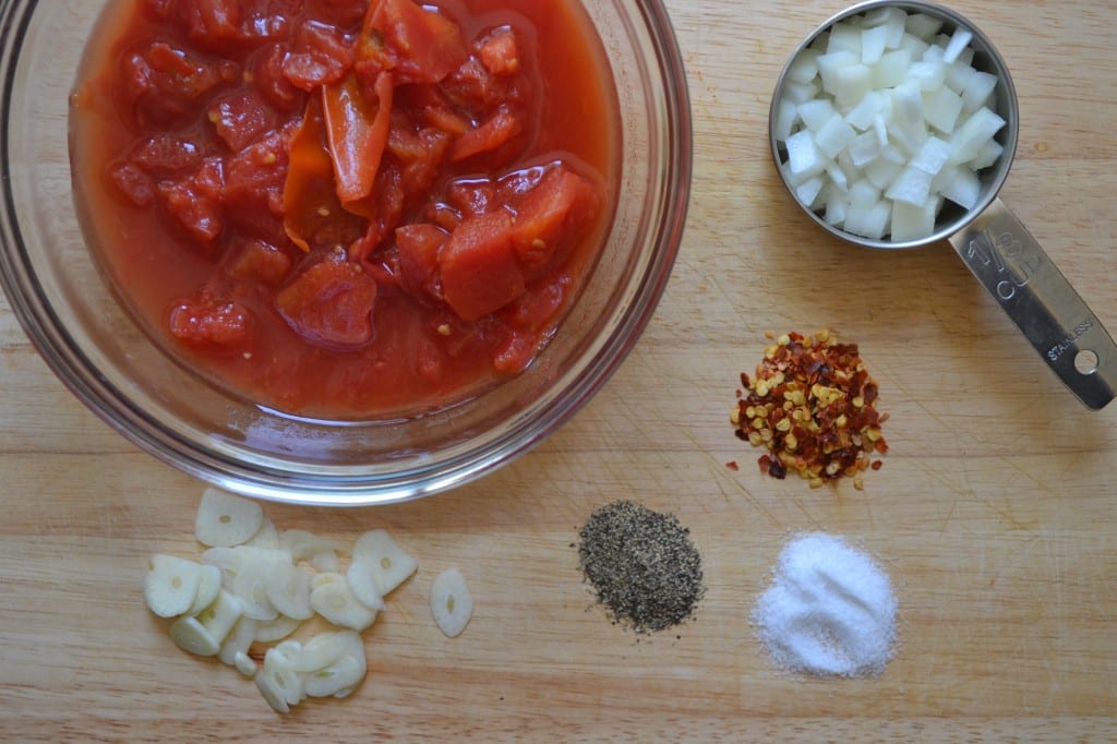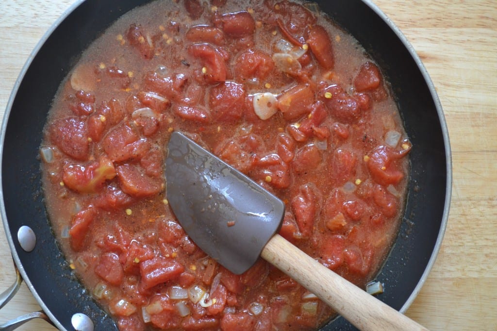 Turn the heat down to low and add the can of diced tomatoes along with the salt, pepper, and crushed red pepper flakes. Cover skillet with a lid and simmer for fifteen minutes.