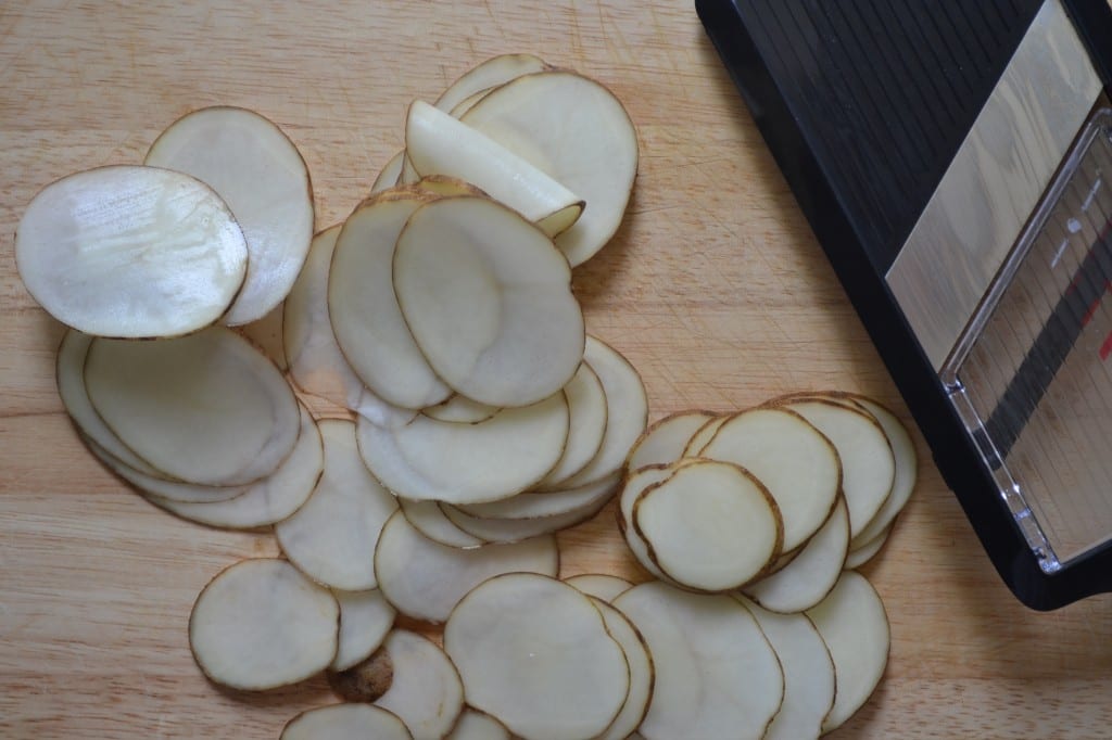 Stack the potato slices about five high. Place a sliver of butter in the middle of each stack. Drizzle the rest of the olive oil over the potato stacks.