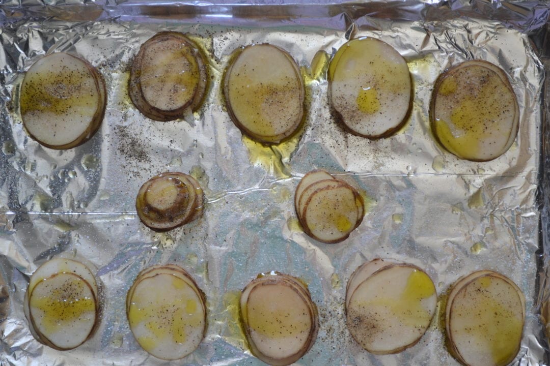 Thinly slice the potato. Season the potato slices with salt, pepper, and garlic powder. Line a baking sheet with tin foil and then pour half the olive oil on to the foil.