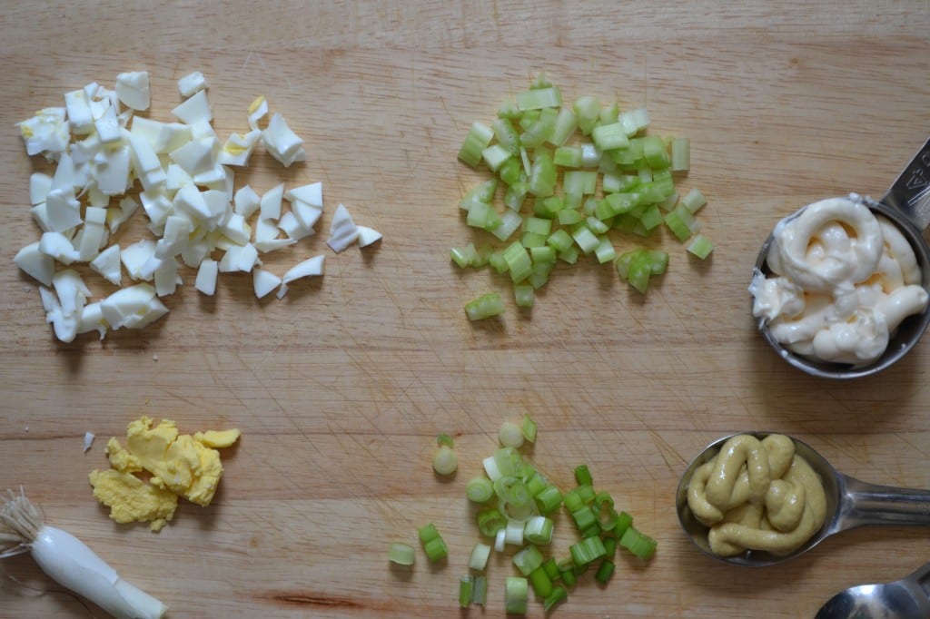 While the potatoes roast, combine the chopped egg whites, celery, green onion, mayo, mustard, salt, and pepper in a small bowl. Use a spoon to mix all the ingredients together. Chill until the potatoes are done.